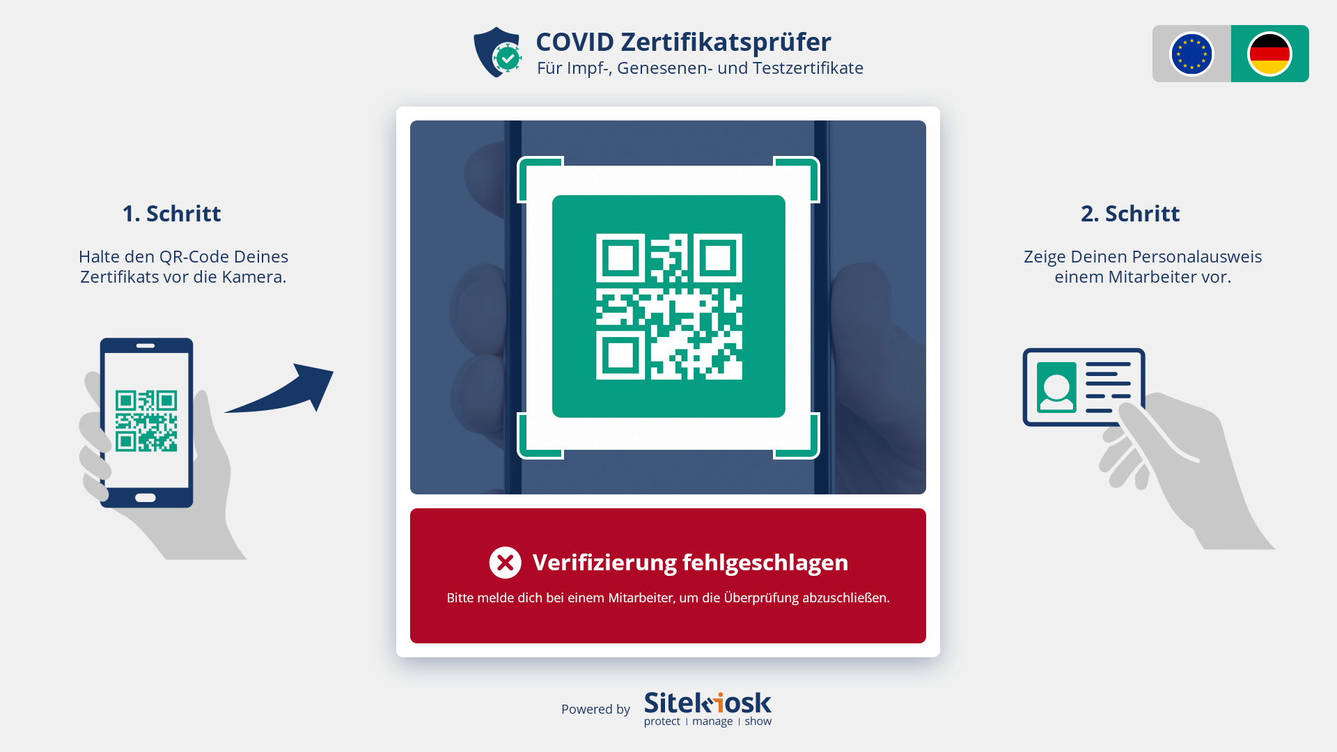 Für die Überprüfung des Zertifikats benötigen Sie am Eingang vor Ort entweder ein Android-Tablet oder einen Windows-PC mit Kamera oder QR-Code-Scanner zum Einlesen des im Zertifikat angegebenen QR-Codes sowie Bildschirme, auf denen die Statusinformation für Ihre Besucher angezeigt werden.