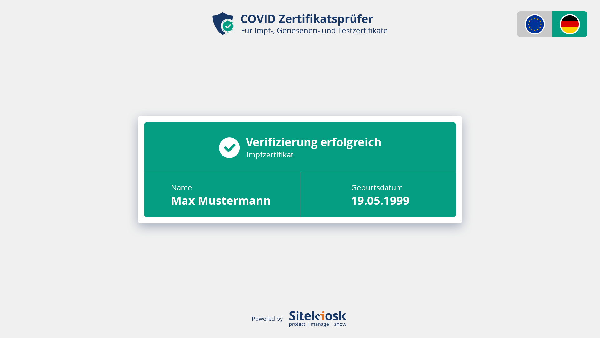 Die Anwendung liest lediglich die Informationen des Zertifikats aus, die über den QR-Code bereitgestellt werden und überprüft deren Gültigkeit: Status des Zertifikats, Name und Geburtsdatum der Person.